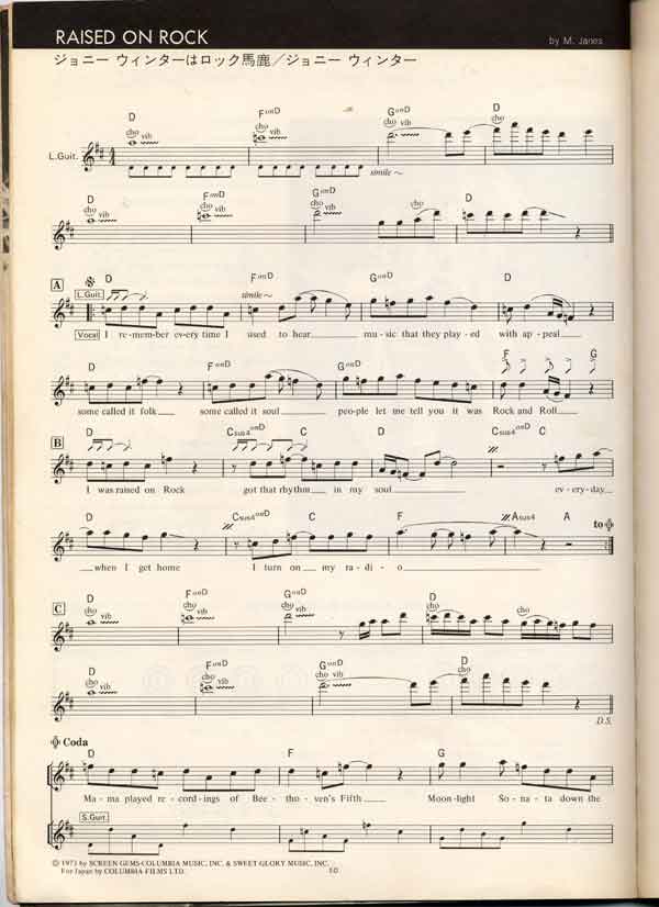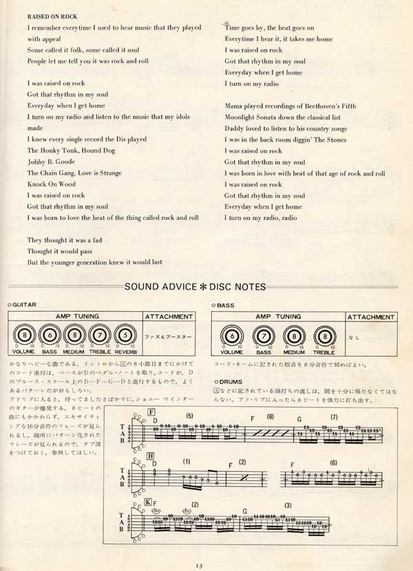 1970年代ヤマハから発売されたギター雑誌。価格は1,000円。”Raised On Rock(John Dawson Winter III)”の歌詞やバンドスコア、ギターのセッティング方法など掲載。曲目は